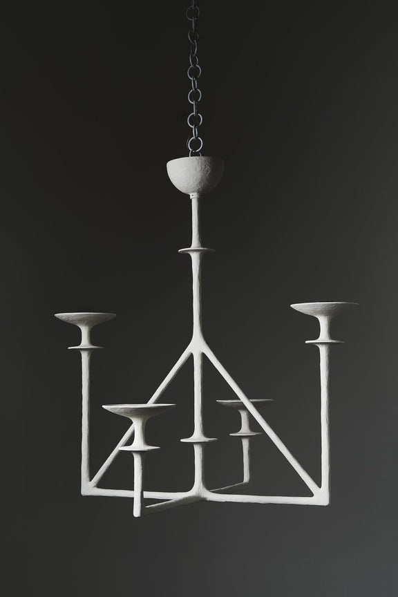 The Ewa chandelier embodies a delicate balance between softness and structure. Handcrafted from sculpted plaster, its fluid, organic form evokes a sense of suspended motion — as if light itself has taken shape. The finely sanded matte surface gently diffuses illumination, wrapping the room in a warm, tranquil glow.