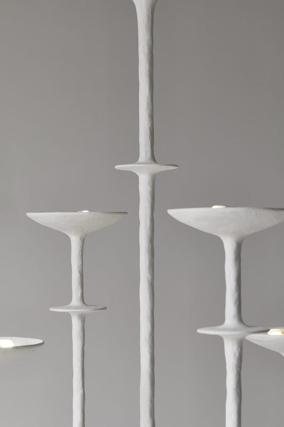 The Paros chandelier embodies minimalist elegance through its sculpted plaster form and refined geometry. Each curve is hand-shaped with precision, giving the piece a tactile depth that softly interacts with light. The matte plaster surface diffuses illumination gently, creating a serene and atmospheric glow.