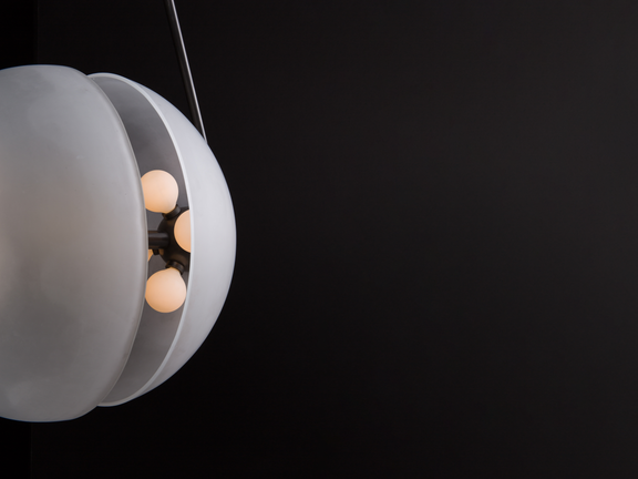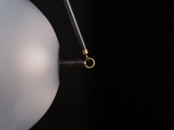 Inspired by the mechanics of neural synapses. this pendant is composed of two hand-molded glass domes that require a 4-art firing process. A brass orb floats in transit between the two hemispheres.