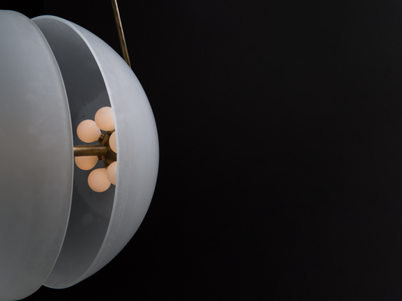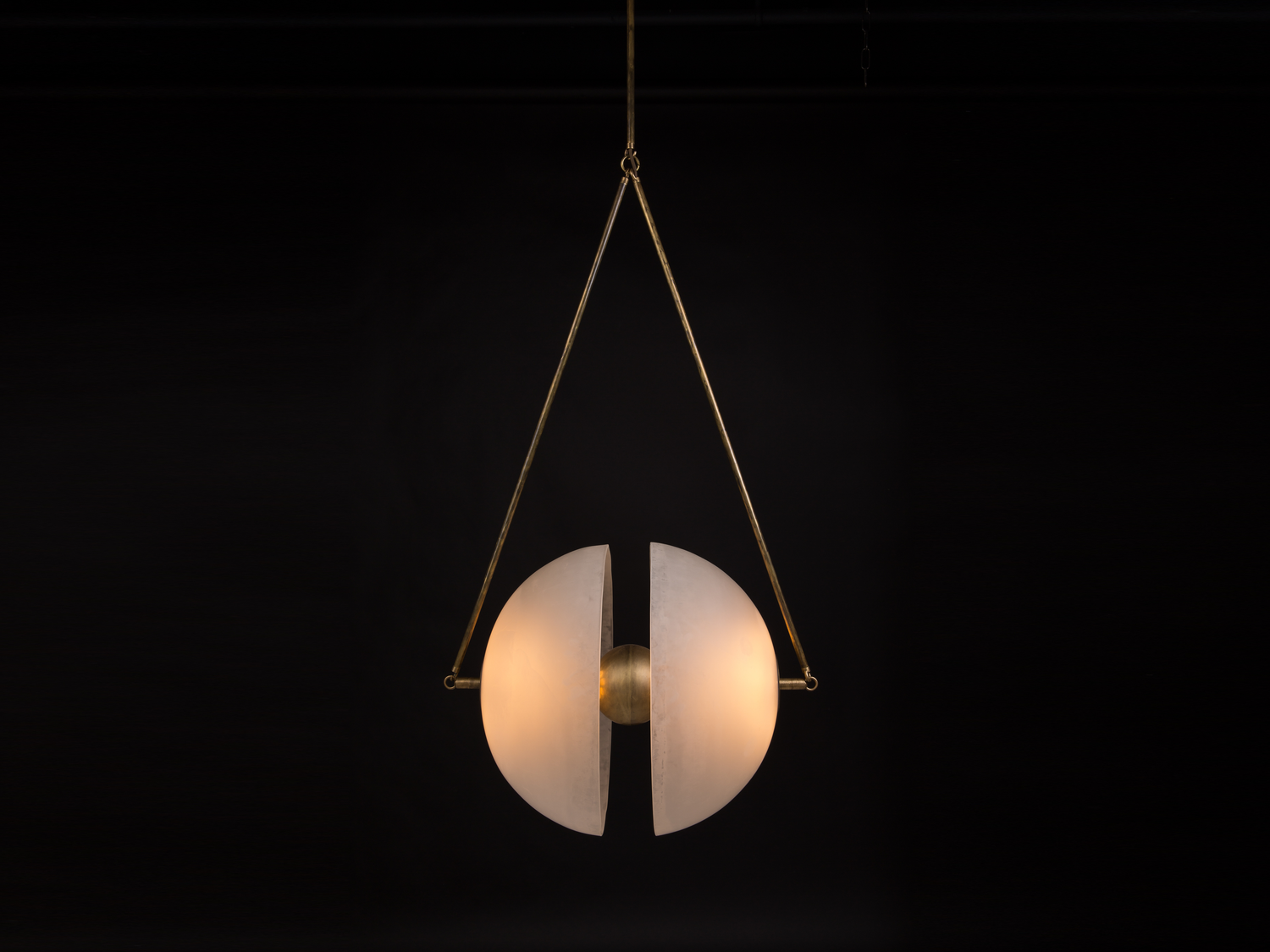 Inspired by the mechanics of neural synapses. this pendant is composed of two hand-molded glass domes that require a 4-art firing process. A brass orb floats in transit between the two hemispheres.