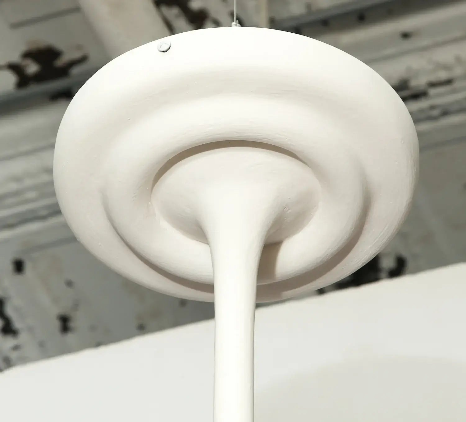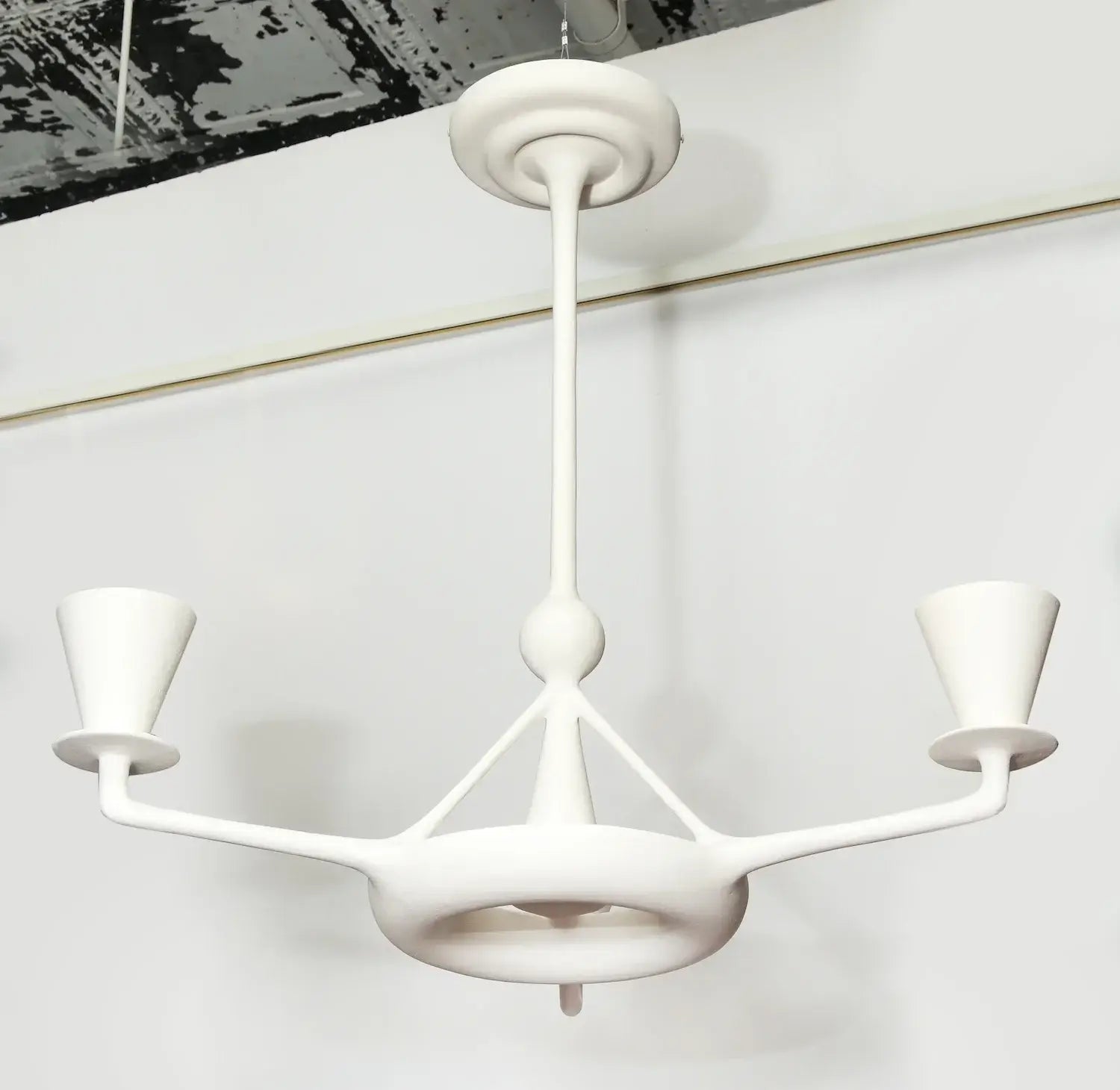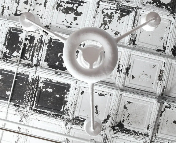 Sculptural fixture in plaster with three extending arms and cups at the end of each. Beautiful center structure and canopy. Each cup comes outfitted with a 2-pin G9 socket, suitable for halogen or LED bulbs. If the fixture is to be UL listed, candelabra bulbs must be used instead. Please consult us upon ordering.
